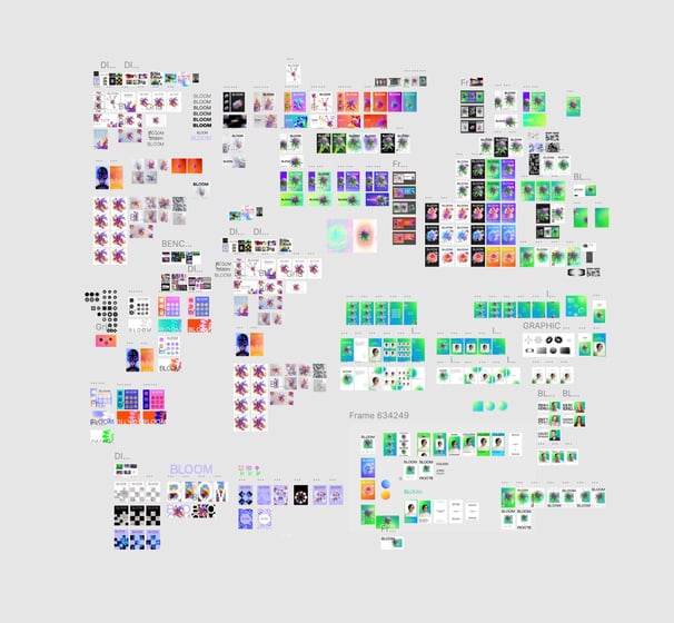 The flowers were then edited and adapted to be used as design assets. Finally, after exploring multiple visual paths, the visual identity came together, when the AI generated assets were combined with a bold typeface, vibrant gradient colour palette and geometric graphic elements to make the identity refined, cohesive and scalable.